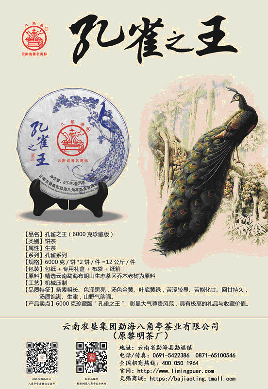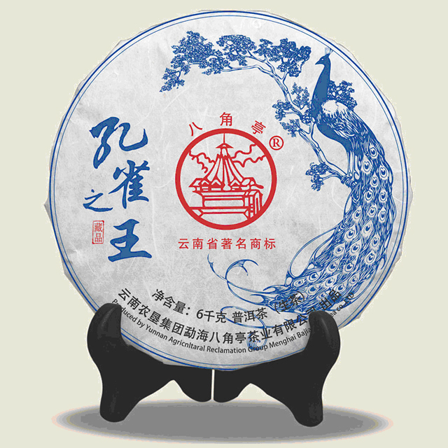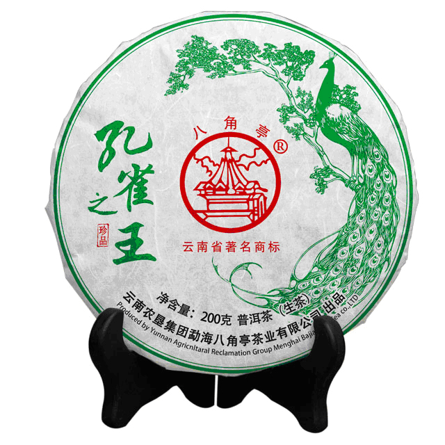 勐海八角亭茶业有限公司坐落于西双版纳州勐海县勐遮镇,是普洱茶核心产地勐海茶区目前唯一国营性质茶企。孔雀系列是八角亭茶业代表性产品之一,自2005年起就有“孔雀之乡七子饼茶”普洱茶产品面市,受到众多茶友的认可与追捧。2016年八角亭荣誉出品“孔雀之王”精选云南勐海布朗山生态茶区乔木老树为原料,生长的环境云雾缭绕,温暖湿润山高林密,远离污染,是大自然孕育而成的天然绿色健康产品。可谓:经典一脉相传、尽显王者风范。